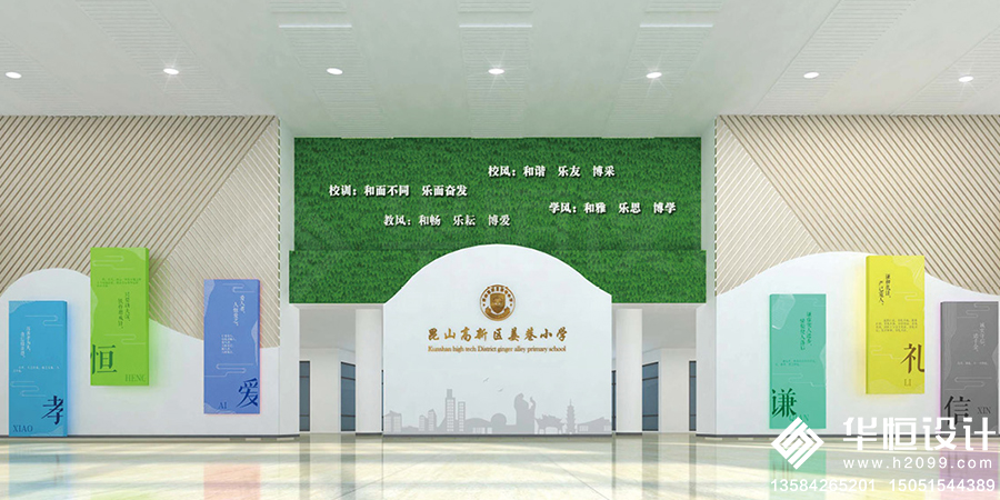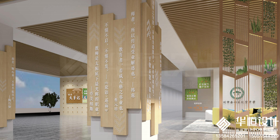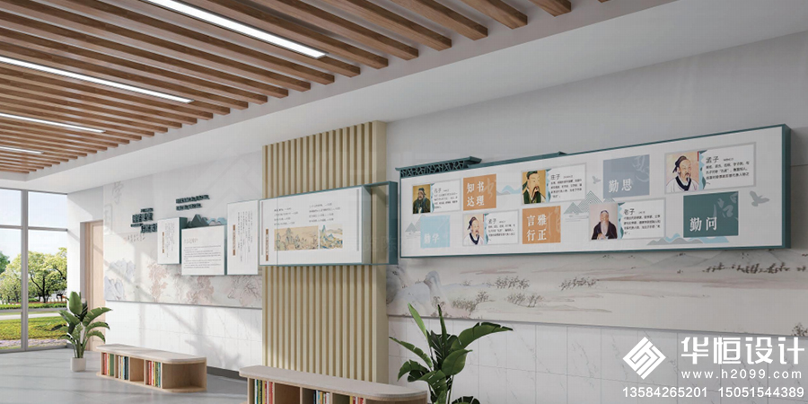 设计注重传统与现代的融合,以淡雅的水墨画风格为背景,山水之间,学校文化深远博大。通过艺术化的设计,将学校的“三风一训”精髓融入每一寸空间,使其成为校园文化的视觉焦点和精神象征。